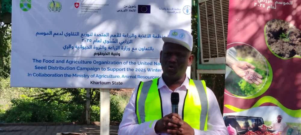 نظم قطاع الإرشاد ونقل التقانة بوزارة الزراعة والثروة الحيوانية والري بولاية الخرطوم برنامجا احتفاليا بمنطقة العجيجة بمحلية كرري اليوم بمناسبة توزيع التقاوي لصغار المزارعين وربات الأسر بالولاية المقدمة من منظمة للأغذية والزراعة العالمية الفاو.وشهد الاحتفال د.سر الختم فضل المولى عبد اللطيف المدير العام لوزارة الزراعة والثروة الحيوانية والري بولاية الخرطوم والسيد هونج يانج ممثل المنظمة بالسودان.وقال ممثل الفاو أن المنظمة قدمت 22 طن من التقاوي لدعم المزارعين كما أنها ستعمل مع شركائها والمانحين لدعم التنمية الزراعية بالبلاد.من جانبه أشاد المدير العام بدور المنظمة في دعم القطاعين الزراعي والحيواني بالولاية، مشيرا إلى التدمير الذي لحق بالقطاعين على يد المليشيا المتمردة وخروج مساحة 195 الف فدان من دائرة الإنتاج، داعيا المنظمة إلى تقديم مزيدا من الدعم وإصلاح البنية التحتية للزراعة والمتمثلة في توفير الطاقة البديلة للمزارعين.وفي الختام تم توزيع نماذج من التقاوي للأسر المستهدفة ببرنامج الزراعة المنزلية وصغار مزارعين للزراعة في الحقول.