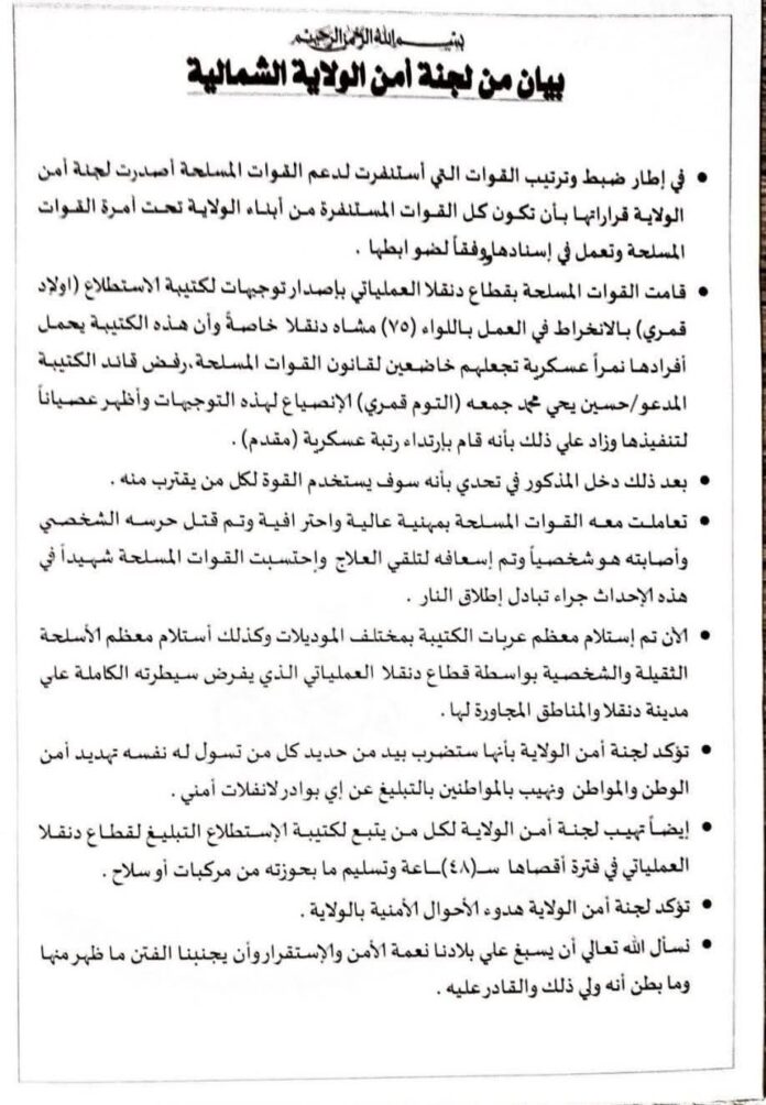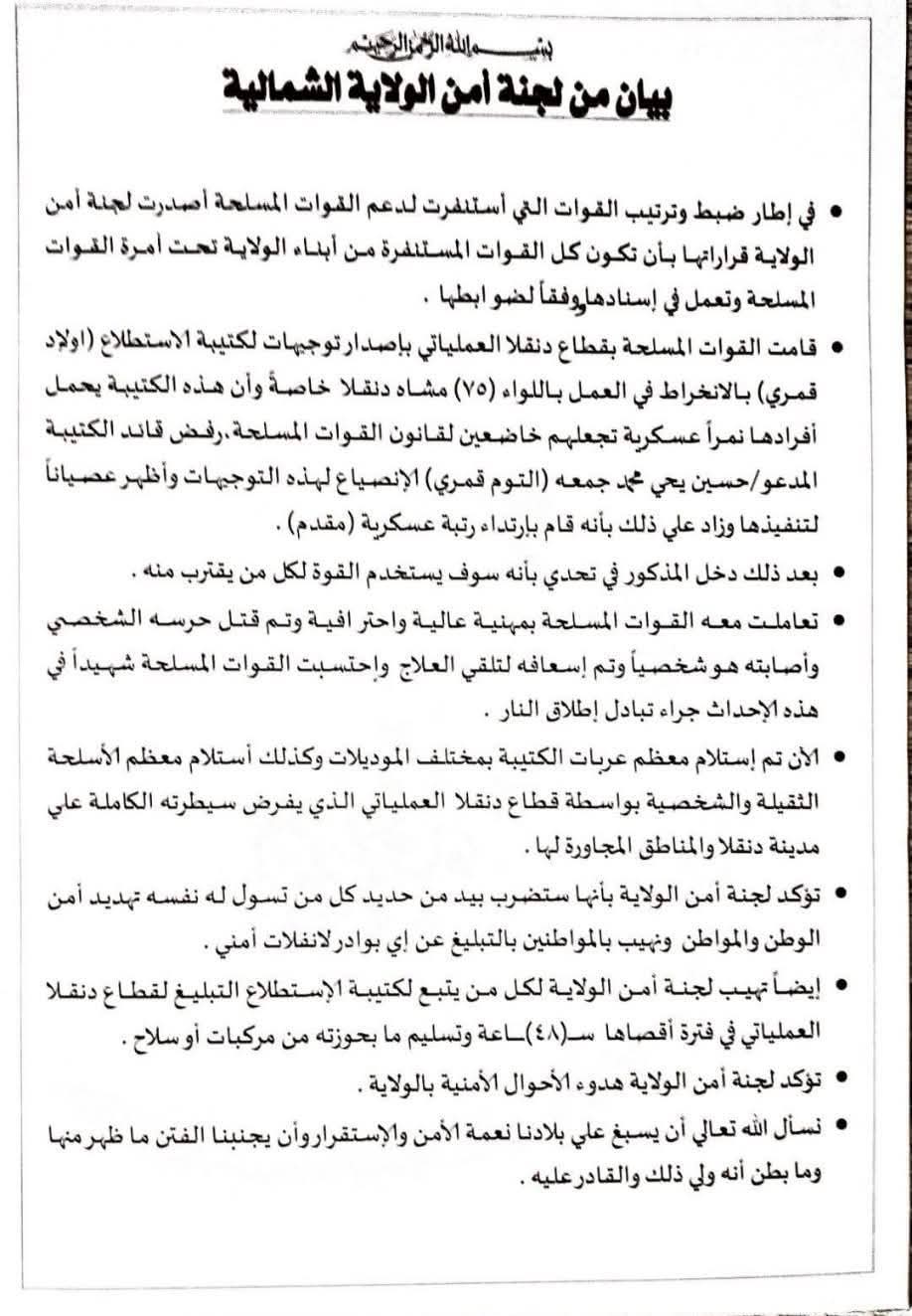 بيان من لجنة أمن الولاية الشمالية. في إطار ضبط وترتيب القوات التي أستنفرت لدعم القوات المسلحة أصدرت لجنة أمن الولاية قراراتها بأن تكون كل القوات المستنفرة من أبناء الولاية تحت أمرة القوات المسلحة وتعمل في إسنادها وفقاً لضوابطها … قامت القوات المسلحة بقطاع دنقلا العملياتي بإصدار توجيهات لكتيبة الاستطلاع (اولاد قمري) بالانخراط في العمل باللواء (٧٥) مشاه دنقلا خاصة وأن هذه الكتيبة يحمل أفرادها نمراً عسكرية تجعلهم خاضعين لقانون القوات المسلحة، رفض قائد الكتيبة المدعو / حسين يحي محمد جمعه التوم قمري) الإنصياع لهذه التوجيهات وأظهر عصياناً لتنفيذها وزاد علي ذلك بأنه قام بإرتداء رتبة عسكرية (مقدم) .. بعد ذلك دخل المذكور في تحدي بأنه سوف يستخدم القوة لكل من يقترب منه .. تعاملت معه القوات المسلحة بمهنية عالية واحترافية وتم قتل حرسه الشخصي وأصابته هو شخصياً وتم إسعافه لتلقي العلاج واحتسبت القوات المسلحة شهيداً في هذه الإحداث جراء تبادل إطلاق النار. الآن تم إستلام معظم عربات الكتيبة بمختلف الموديلات وكذلك أستلام معظم الأسلحة الثقيلة والشخصية بواسطة قطاع دنقلا العملياتي الذي يفرض سيطرته الكاملة علي مدينة دنقلا والمناطق المجاورة لها .. تؤكد لجنة أمن الولاية بأنها ستضرب بيد من حديد كل من تسول له نفسه تهديد أمن الوطن والمواطن ونهيب بالمواطنين بالتبليغ عن إي بوادر لانفلات أمني .. إيضاً تهيب لجنة أمن الولاية لكل من يتبع لكتيبة الإستطلاع التبليغ لقطاع دنقلا العملياتي في فترة أقصاها سـ (٤٨) ساعة وتسليم ما بحوزته من مركبات أو سلاح .. تؤكد لجنة أمن الولاية هدوء الأحوال الأمنية بالولاية .. نسأل الله تعالي أن يسبغ علي بلادنا نعمة الأمن والإستقرار وأن يجنبنا الفتن ما ظهر منها وما بطن أنه ولي ذلك والقادر عليه .. الرحمة والمغفرة لشهداء وطننا الحبيب بملحمة العزة والكرامة من القوات المسلحة والقوات المساندة لها من قوات الشرطة وجهاز المخابرات والمستنفرين والمواطنين وعاجل الشفاء للجرحى والمصابين وعوداً حميداً للمفقودين وأن يحفظ المقاتلين في المعاركنصر من الله وفتح قريب